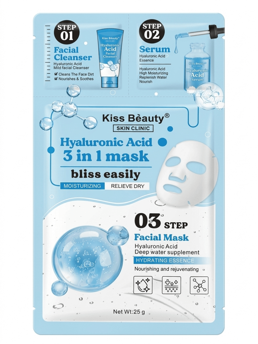 Маска для лица 3в1 Kiss Beauty с гиалуроновой кислотой
